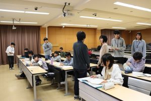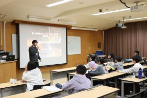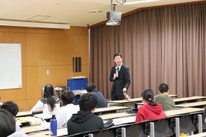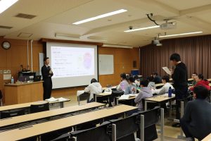 招待講演では、「モノの動きをデザインする~機械から人の心までを操る~」と題して、兵庫県立大学教授 南裕樹先生に講演をしていただきました。南先生は舞鶴高専の電子制御工学科の出身で、京都大学大学院 情報学研究科博士後期課程を修了後、現在まで、ロボットに関する最先端の研究をされています。講演では、モノの動きをデザインするための制御工学の考え方を知ることで、世の中の見え方が変わってくることや、良い研究テーマを探すために気をつけることなど、様々な分野の研究に活かすことができる、貴重な講演をしていただきました。講演の最後には、皆に大切にしてもらいたいこととして、「個性をみがく」、「縁を大事にする」という心に響くメッセージをいただきました。講演後には、受講生からの質問にも丁寧に答えて頂きました。